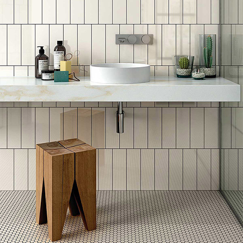 This simple chic tile brings the edge with a hexagon shape tile repeating across your walls and floors. With a mesh sheet, it can be trimmed to fit in smaller spaces, like your shower floor. This tile is easy to install anywhere in your home or business. Available in a matte finish only.